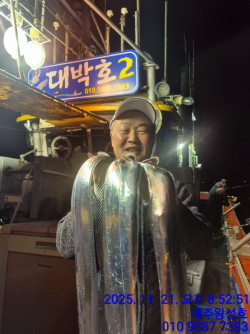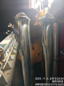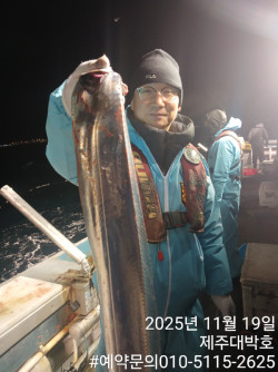 11월7●8일 제주대박호 갈치조황 올립니다ㆍ(용가리가 쏱아지고 있어 실시간 조황 올립니다)(지금 용가리급만 20마리에 3kg도 나왔습니다)#내일부터 몇자리씩 여유있어 급하게 올려봅니다ㆍ월명기간이 끝나고 날씨도 좋아서이번 물때는 호조황이 기대됩니다) (1.2호 자동봉돌투척기 설치)(15단까지 두벌채비 가능합니다)○1호(9.77톤)=12명 010-5115-2625○2호(9.16톤)=10명 010-9887-7383 (((제주대박 (2호 & 1호) 모두다 )))아래사진 누르시면 1호,2호 예약 가능합니다ㆍ 밴드초대 https://band.us/@daebakfishing홈페이지 https://jejudaebak.sunsang24.com○(사무장=선주) 운영하여 고객 응대 100% ○제주대박1호 와 제주대박2호(왕성호)는=같은 항에서 출항하며=같은 시간에 출항,입항=같은 픽업(비행기 및 배편)도 동일=같은 포인트 공유합니다ㆍ ○제주대박1호(대박호)(수협): 0010-8700-2626(송승필) ◎제주대박2호(왕성호)(수협): 0010-9887-7383(송승필) ○공지사항○필독(아래)(실시간예약)누르시면 (공지)내용 있습니다.○제주대박1호(대박호)9.77톤=12석)○제주대박2호(왕성호)(9.16톤)●두벌채비 바로 시작(15단까지 허용)●1호/2호 대포 무료 사용 가능☎예약문의 :010-5115-2625(1호) 예약문의 : 010-9887-7383(2호)☞30년 제주 토박이 선장님(자선장)을 모시고 제주대박호1와 2호는 포인트를 공유합니다. ☞출항지: 제주시 애월읍 하귀1리 1624-7 ※제주대박1호※ 갈치(12석 9.77톤)●출항(16시)<--->철수(06시 전,후) (15시까지 제주공항 도착) (10시이후 항공권 발급) (공항픽업:15시30분(제주대박호 버스:(1)번 대형 주차장) (완도항<=>제주항 픽업합니다(15시 )) (완도항(09시30분 출발)==>제주항 도착(12시10분) (제주항 ==>완도항(08시30분 출발)●선사지급:자동봉돌투척기 무료사용(안전은 본인책임) 아이스박스,팽창식 구명조끼,석식,야식,조식,음료,생수,꽁치 ●임대는 예약시 문자보내시고 회신 확인바랍니다. *전동릴+낚시대+집어등+기둥줄+바늘=합계 3만원 *파손/분실시 비용이 발생할수 있습니다.●밴드 바로가기 https://band.us/@daebakfishing ☞ 자리배정진행☞ 우선배정 순위(2025년 6월20일부터 시행)① 최우선: 3일 이상 연박자(일렬배정)② 우선 : 단체(4인부터) 일렬배정☞예약후, 입금후 (성명/예약일) 문자로 꼭 부탁드립니다. ☞예약취소는 반드시 문자나 전화로 취소 바랍니다. ☎예약문의 :010-5115-2625 ●입금요청 문자 발송후 전화나 문자없으면 자동취소됩니다. (밴드(공지)홈페이지(알림판) 필독후 예약바랍니다) ☞택배&가공&연박시 냉동(무료)가능 (갈치 진공포장:가격인하 ((3500원/4500원))(kg) (사무장님께 말씀주시면 철수때 항구로 직접 가지러 가서 작업해 드립니다(성숙이네 수산 010-5855-9596)【예약 전 필독사항】☞실시간예약란에 (예약완료는= 입금완료)입니다. 본인이 입금대기중일경우 선입금자가 있을경우 선입금자부터 예약완료 됩니다. ☞예약 및 환불 규정 *7일이내 취소시 100%환불 *3일이내 취소시 50%환불 *출조전일 및 당일: 환불 없음. ☞신분증 미지참시 승선이 불가하오니 지참후 승선. ☞멀미약은 배에서 지급하지 않습니다.☞선내 주류 반입 및 음주 절대 금지☞임대는 예약시 꼭 말씀해주시고 파손/분실시 비용청구○숙소 문의 관련 공지합니다 ○4월1일부터숙소 예약하실때 전화통화로 하시면 됩니다ㆍ통화하실때○꼭! 대박호○라고 말씀해주셔야 ○할인가로○ 예약 하실수 있습니다ㆍ* 문의전화 (호텔) 064-800-4000* 위치 : 제주특별자치도 제주 하귀1리 544-2 (일주서로 7113)- 하나로마트 하귀점 맞은편▶ 더 스테이 센추리호텔 보기(상세정보)http://gjr.kr/0648004000밴드초대 https://band.us/@daebakfishing홈페이지 https://jejudaebak.sunsang24.com
